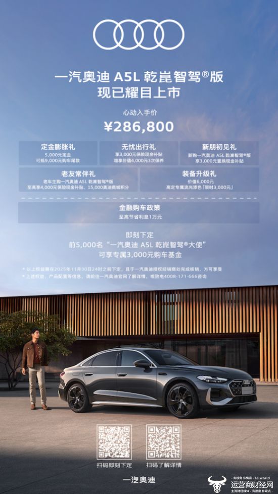 一汽奥迪A5L乾崑智驾®版的专属大定权益还将延续,涵盖现金、保养、置换等丰厚限时礼遇,为用户提供高价值购车体验。2025年11月30日24时之前下定立享五重专属礼遇——定金膨胀礼:5,000元定金抵9,000元购尾款;无忧出行礼:享3,000元保险现金补贴,增享价值4,000元3次保养;新朋初见礼:新购一汽奥迪 A5L乾崑智驾®版享3,000元置换现金补贴;老友常伴礼:老车主购一汽奥迪 A5L乾崑智驾®版至高享4,000元保险现金补贴;装备升级礼:限时3,000元可享价值6,000元高定专属流光漆色;一汽奥迪还为用户提供专属金融购车政策,至高节省利息1万元;此外,前5000名“一汽奥迪A5L乾崑智驾®大使”可享专属3,000元购车基金礼遇。